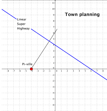ok so I am guessing that i have to draw a line from Pi-ville to the linear super highway. Then determine the slope and y-intercept of that line to develop an equation that represent the best route for the road.