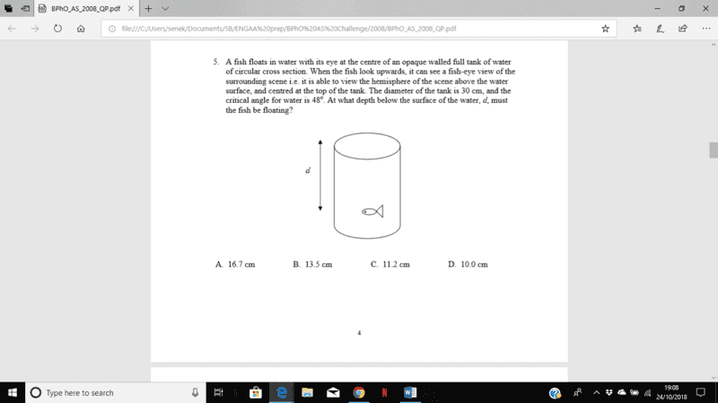 Now I don't understand the questions. The mark scheme says "From the fishes eye to the rim of the tank makes an angle of 48o with the vertical. The emerging ray is horizontal (which is the requirement to see the horizon). Hence the depth of the fish is, d x tan 48o = 15.0, giving d."