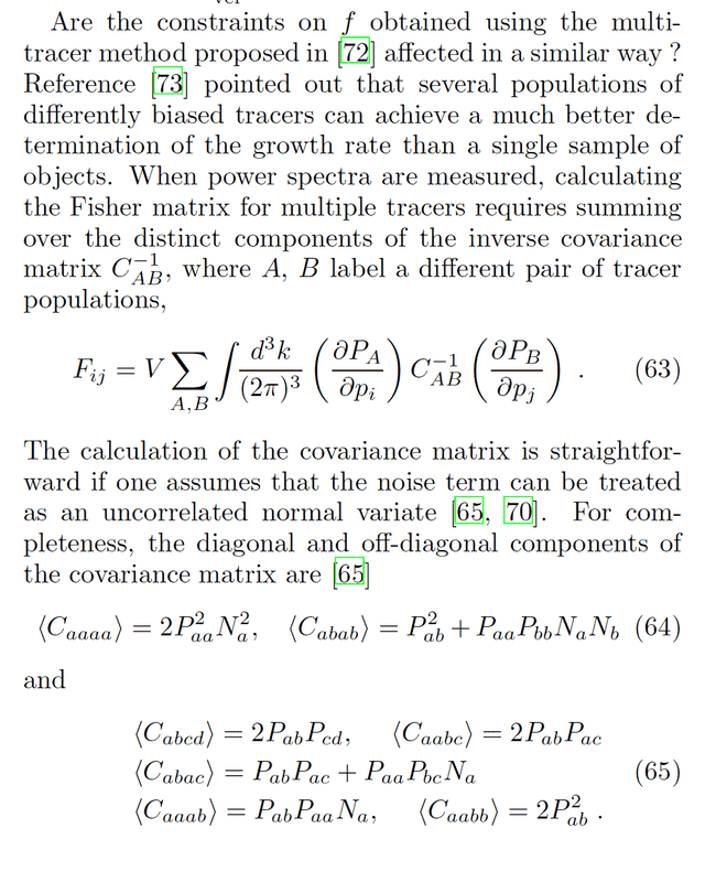 As you can see, into eq(63), there is a sum on every pair of population types. In my case, I have 3 populations (BGS/LRG/ELG), so the term ##C^{-1}_{AB}## should have a size of 4x4 (with ##aa=BGS\quad##, ##bb=LRG\quad##, ##cc=ELG\quad## and ##bc=LRGxELG##) like this :