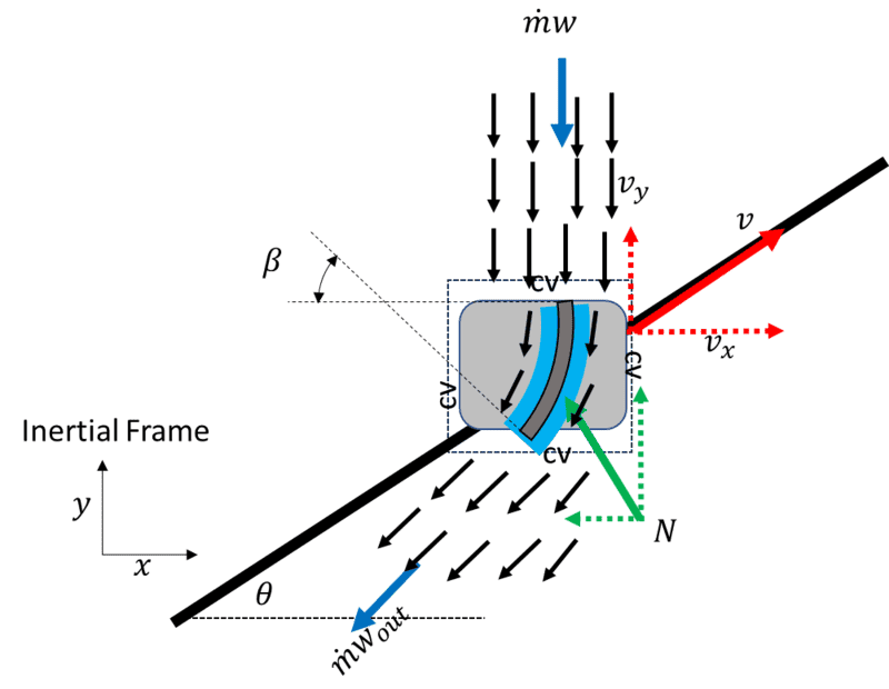 I still can't figure out what all the confusion is surrounding ##\beta##, perhaps I'm miss interpreting what it "looks like", but I think all of that not an issue. If the outflow is exiting at a constant angle ##\beta## (imagine there is a pipe sticking out of the control volume at angle ##\beta## relative to vertical in the diagram, it checks out; No bounds on velocity for some angle in this idealism. Any real body faces significant opposition to that proposition via drag. In theoretically idealistic cases I have to cast out my prior doubt of this.