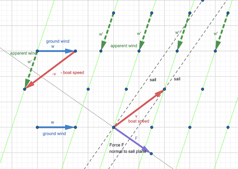 If the sail were fixed at the angle ##\beta##(making it a constant), that you say it is ( whatever it is), with the force ##F## perpendicular to the sail that implies that ## \frac{F_y}{F_x} ## or ## \frac{F_x}{F_y} ## is a constant w.r.t. to velocity.Gleb1964 said:The optimal sail would be bisecting between apparent wind direction and boat direction, the force on the sail is perpendicular to the sail plane. That mean the optimal force direction is known for every boat speed.