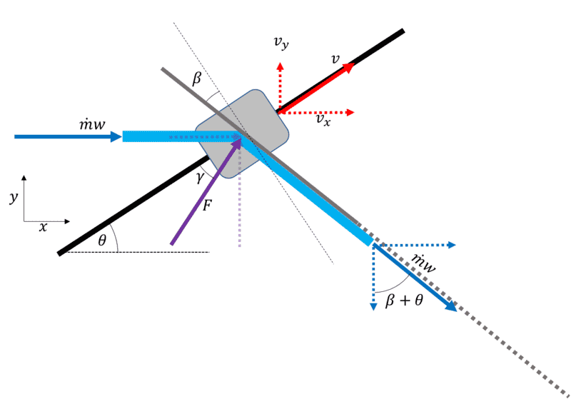The problem is that you don't understand that I'm adding vectors ( well, technically scalars that are associated with the component vectors)! I wrote out the forces acting on the sail in post #154. For example: The momentum of the incoming flow for ##F_x## has three terms; the first two combined describe the momentum of the outflow (notice the dependency of the outflow momentum on component of cart velocity w.r.t the ground frame). The last term describes the momentum inflow relative to inertial frame.A.T. said:But your diagram doesn't have ##\dot m_o v_o## in it. The outgoing flow is labeled ##\dot m w##, which is of course wrong, because the flowspeed ##w## (in the ground frame) will change after the interaction with the sail.