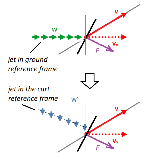 The jet CANNOT push the cart in the direction of the jet FASTER than the jet is going in the direction of the jet! No matter what you do to the sail orientation, or what angle you chose to go at relative to the incoming jet. Making anything you want variable... Momentum CANNOT enter ( nor exit) the cart at ##v_x = w##. The mass flow rate ##\dot m ## is a true "mathematical factor" in the sense that it is multiplied by anything you can come up with for the velocities- any configuration your heart desires. Short of DeVine intervention by the hand of GOD no matter what you do to the sail to maximize the acceleration of the cart there is a hard limit.Gleb1964 said:Here is your jet, as you wish. One in the ground frame and another in the cart frame. I have to split it in the volumes to illustrate somehow the transformation.