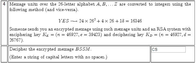 - Another participant suggests converting the string "BSSM" into a number using a specific scheme and then applying the RSA decryption formula.