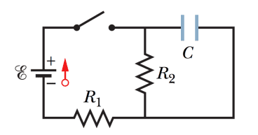 In Fig. 27-66, R1= 10.0 kΩ, R2 = 15.0 kΩ, C = 0.400 µF, and the ideal battery has emf E = 20.0 V. First, the switch is closed a long time so that the steady state is reached. Then the switch is opened at time t = 0. What is the current in resistor 2 at t = 4.00 ms?