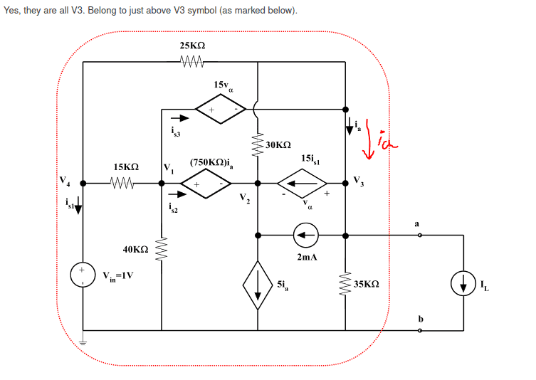 I'm supposed to solve this using nodal analysis. No biggie! I'm just not sure how to handle ia. I've never seen a current indicated in a junction crossing. I searched the web and my textbook and found zilch. I asked a GSI and was informed it is indeed written where is supposed to be. Within the node V3. Which has me puzzled. Best I could think of is it's specifically the sum of the 30k 25k & 15Valpha branch currents. Within my mind this interpretation is in superposition; it's flat wrong, and reasonable enough but odd and arcane if indeed correct. I can manage solving once I know how to approach ia, but can anyone weigh in on the spooky current?