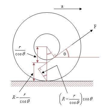 A rope is pulled off with a force F from a combined cylinder. the smaller cylinder's radius is r and the big one's is R. the cylinder rotates on a rough surface without sliding. the force makes an angle θ with the horizon.