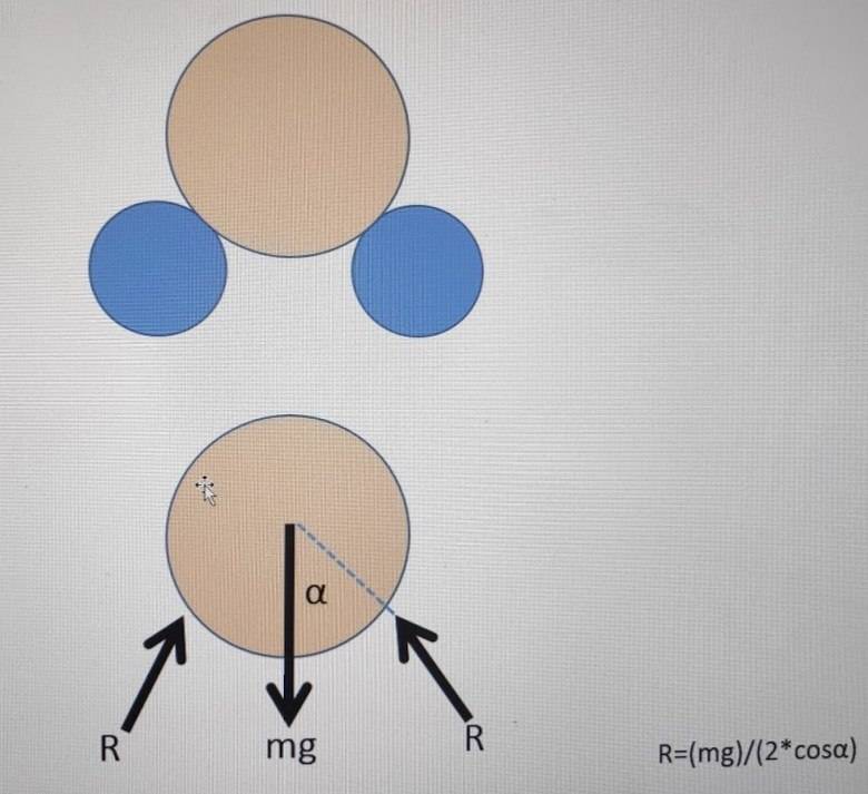 The discussion revolves around calculating the static reaction force on a cylinder supported by two rollers, particularly focusing on the relationship between the contact angle and the reaction force in relation to the weight of the cylinder. The scope includes theoretical reasoning and conceptual clarification regarding forces and their sources.