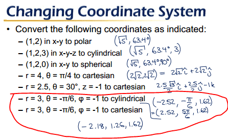 This discussion focuses on converting coordinates from spherical to cylindrical and Cartesian systems, specifically using the values r = 3, θ = -π/6, and φ = -1. The correct conversions yield cylindrical coordinates of (2.52, -π/6, 1.62) and Cartesian coordinates of (-2.18, -1.26, 1.62). The conversation highlights the importance of understanding the conventions used for spherical coordinates, particularly the interpretation of negative values for r and φ, which involve reflections through the origin and adjustments in angle.