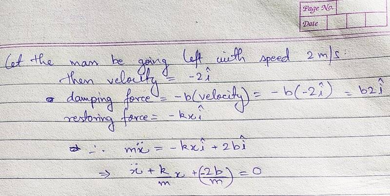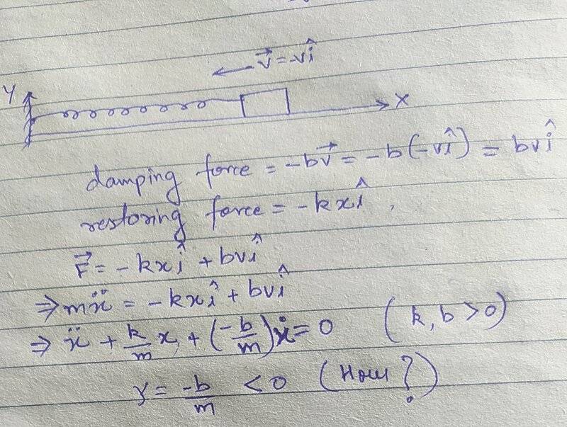 - I'm studying Damped harmonic oscillation from Kleppner and Kolenkow. However I'm stuck at one point. Lets take the case of a mass at one end of the spring, which is oscillating (left and right) with some damping. Lets say, at some instant, the mass is moving towards the equilibrium position from the right side. Then the restoring force would be towards the left. The damping force would be towards the right(since the velocity is towards left). Now kindly see the screenshot attached. In that page, value of gamma would be negative, which would mean that value of alpha would be negative, which in turn would mean that the amplitude in equation 11.10 would INCREASE exponentially. Now, this should not be happening since we are studying damped harmonic oscillation.