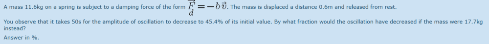 Then 0.93466/0.9057 = 1.03198, so the heavier mass dampens 1.03 times more than the lighter mass. If the lighter mass decreases the oscillation to 72.1%, then the heavier mass would be 72.1%*1.03198 = 74.4, but this is wrong. It should be 80