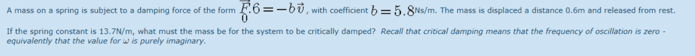 Since its critically damped that means k/m=(b/2m)^2, which would mean w=ib/2m. So m=ib/w. My issue now is that I need to find work.