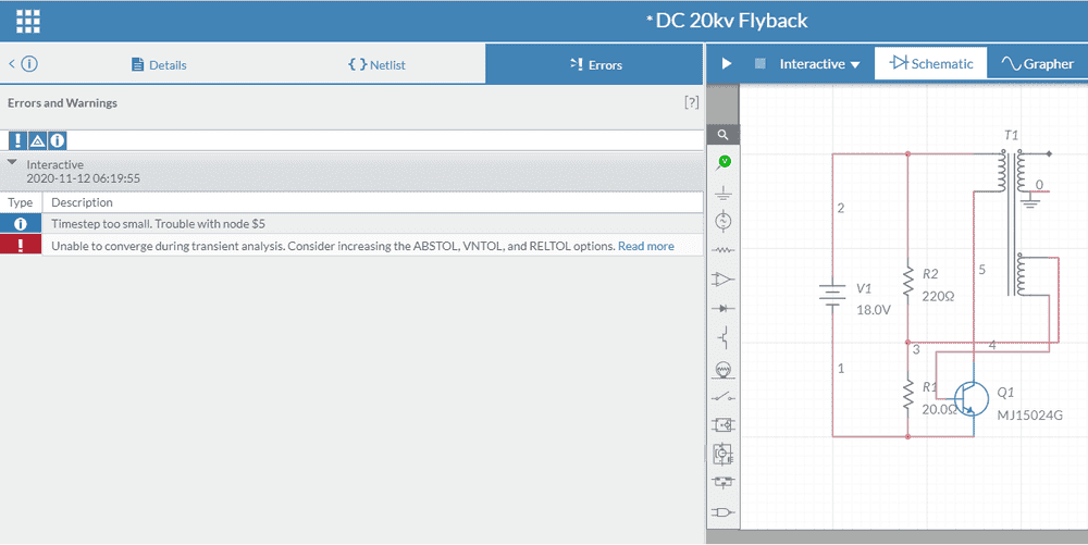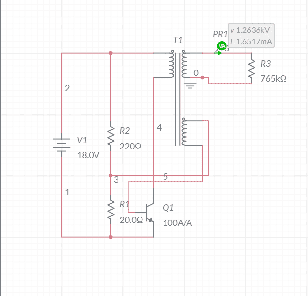 The discussion revolves around the challenges of simulating a DC 20kV flyback converter circuit in Multisim, focusing on the appropriate transformer models, transistor connections, and circuit parameters. Participants explore various aspects of the circuit design, including transformer turn ratios, inductance calculations, and the behavior of different transistor types.