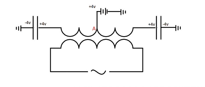 The discussion centers on the feasibility of a circuit designed to maintain a DC bias on capacitors, specifically with a +4V bias at point A. Participants confirm that while the circuit appears functional, the "-4V" notes should be removed since the capacitor outsides connect to ground (0V). The center tap is confirmed to be biased at 4V, with the capacitor windings experiencing both 4V DC and an AC component due to transformer action.