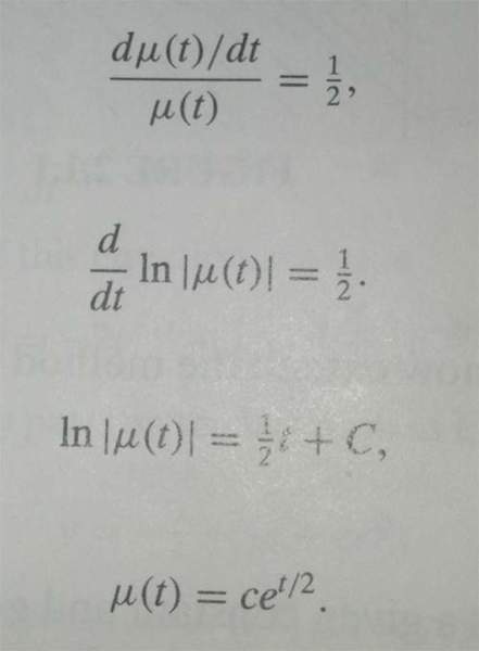 This all seems kind of pointless. Integrating ##\frac{d\mu(t)/dt}{\mu(t)}## to get ##\ln|\mu(t)|##, you've used the fact you're trying to show, so why bother? Also, the righthand side is only equal to qt if q is a constant, which it most likely isn't.1MileCrash said:That's not really my issue. I just like to see it written out even if it is recognizable - I can integrate and differentiate until the cows come home.
