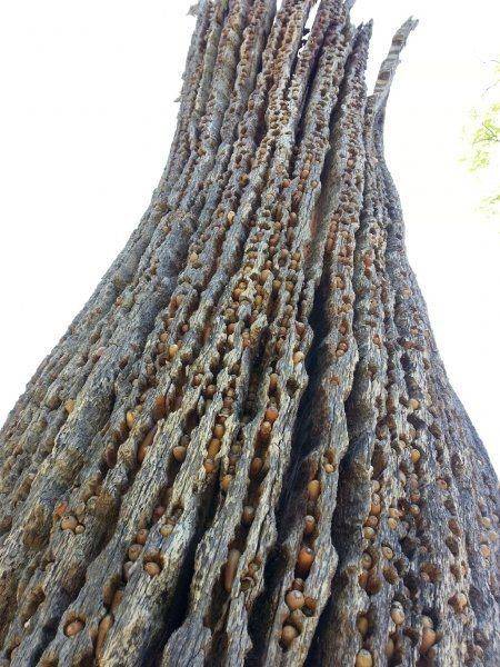 - Another participant identifies the acorn woodpecker as the likely culprit, explaining their behavior of creating granaries by drilling holes in dead trees and storing acorns.
