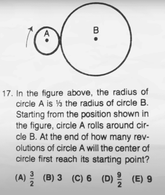 The discussion revolves around a geometry question that was previously featured on the American SAT test. Participants explore the nuances of the problem, which involves the motion of a smaller circle rolling around a larger circle, and the implications of this motion on the number of rotations completed. The conversation includes reflections on the question's unintuitive nature and its removal from the SAT.