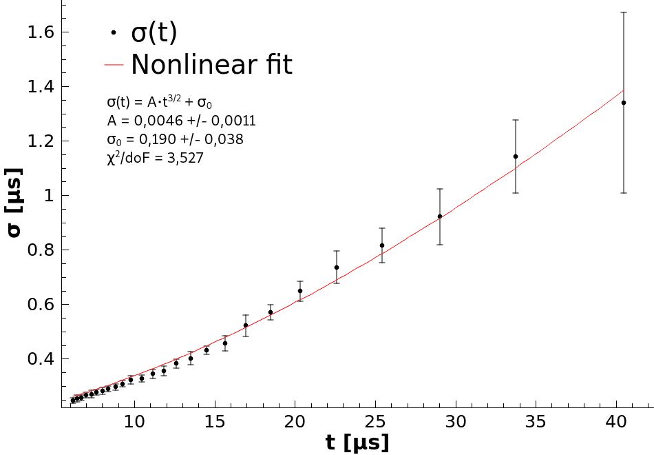 Hello, I have a problem with my data analysis from my lab. My goal is to find drift velocity of the electron and it's diffusion coefficient. The experiment looked like this: I've measured the time difference between signals on two gaseous detectors. The source of the signal were ##\alpha## particles from radioactive element inside the measurement system. Alpha particles ionize the gas inside chamber and then electrons are accelerated in a constant potential etc. Everything went fine until professor said that full width at half maximum should be ##\sigma = A \cdot t^{3/2} + \sigma_{0}## and it does match my data: