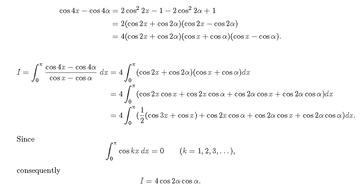 The discussion revolves around evaluating the definite integral \[I = \int_{0}^{\pi}\frac{\cos 4x - \cos 4\alpha }{\cos x - \cos \alpha }dx\] for some \(\alpha \in \mathbb{R}\). The focus is on the mathematical reasoning and potential solutions related to this integral.