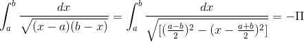 [tex] \int_{a}^{b}\frac{dx}{\sqrt{(x-a)(b-x)}}=\int_{a}^{b}\frac{dx}{\sqrt{\left(\frac{b-a}{2}\right)^{2} -\left( x-\frac{a+b}{2}\right)^{2}}}[/tex]