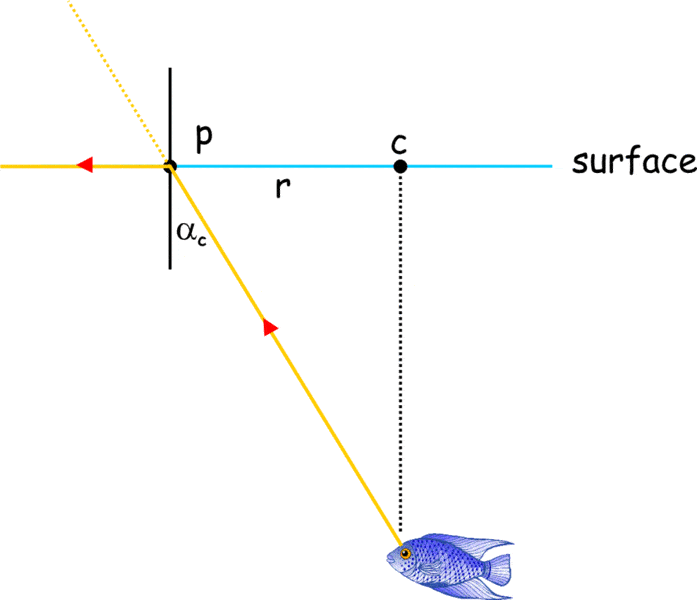 The discussion centers on the concept of the radius of sight for a fish submerged 3 meters underwater, focusing on how light refraction affects visibility. It explains that the fish can only see a circular region on the water's surface due to the refraction of light, which creates a limit defined by the critical angle of incidence. Total internal reflection prevents light from entering the fish's eye beyond this critical angle, thus restricting its view. The conversation suggests visualizing this with a light bulb analogy to trace light paths and understand the implications of Snell's law. Ultimately, the radius of sight is determined by the angles at which light can refract into the water and reach the fish's eye.