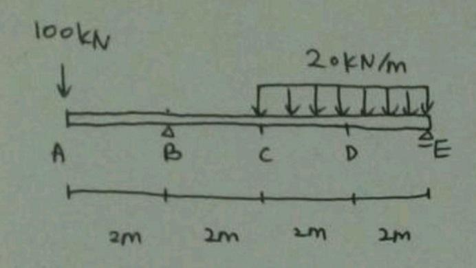 for the reactions R.b=160KN, R.e=20KN upwards were found after the calculation of momentum equilibrium equation.