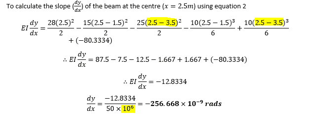 EI dy/dx=(28(2.5)^2)/2-(15(2.5-1.5)^2)/2-(25(2.5-3.5)^2)/2-(10(2.5-1.5)^3)/6+(10(2.5-3.5)^3)/6+(-80.3334)