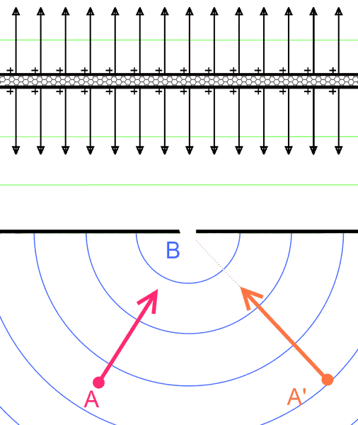 4: The electric field "flows through" the hole, but the force on the test charge A will still direct to the point C. The measured force will as big as it would come from a distance AC, just like as it would be without the wall.