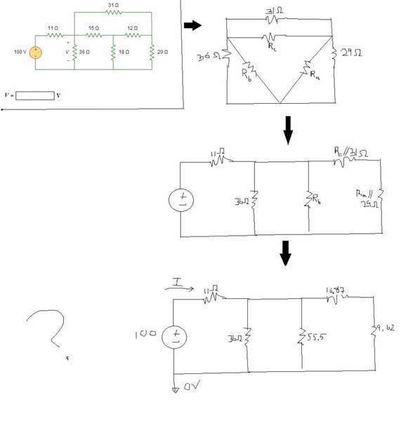 I have worked through most of the solution in the jpg. However, I am stuck. I know I need to find I, because if I can find I, it would be very simple to use Ohm's law in the original circuit.