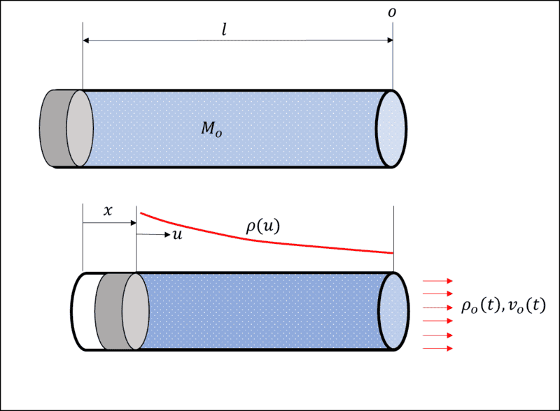 At ##t = 0##, the mass of air in the tube is ##M_o##, and the system is static with tube length ##l##. The ##x## coordinate describes how far along the tube the piston has advanced at time ##t##. The ##u## coordinate ranges from the piston face to the end of the tube ## 0 \leq u \leq l-x ##