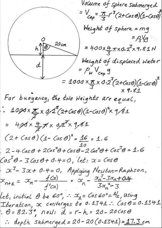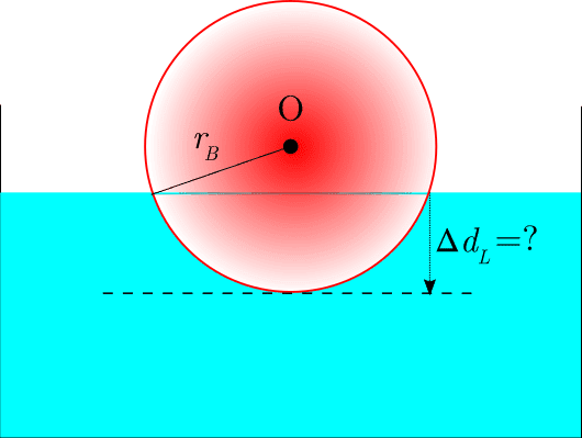 The discussion revolves around a problem involving the submerged depth of a sphere in a liquid, specifically focusing on the relationship between the volume of the sphere and the volume of liquid displaced. The subject area includes concepts from fluid mechanics and geometry, particularly the volume of spherical caps and the principles of buoyancy.