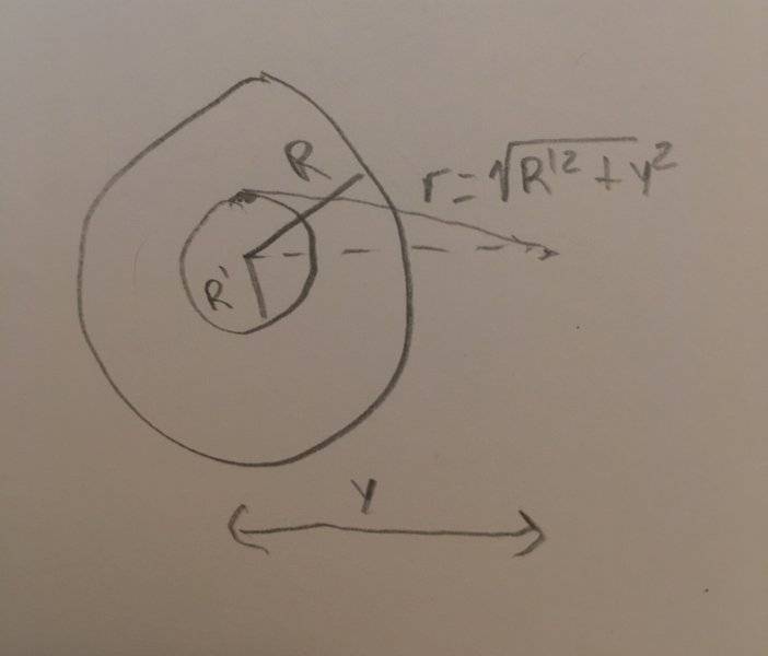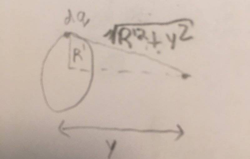 V=∫dV=∫(k2QR'dr)/[R2(R'2+y2)1/2]=(kQ/R2)∫2R'dr/(R'2+y2)1/2