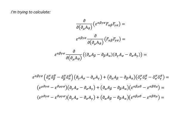 The discussion revolves around the mathematical treatment of derivatives involving the Levi-Civita symbol in the context of field theory, specifically focusing on the expression involving the electromagnetic field tensor and its derivatives. Participants explore the implications of antisymmetrization and the correct placement of indices in tensor notation.