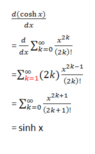 - A third participant provides a reformulation of the sum, showing how to rewrite the expression for the derivative of cosh(x) using factorials and changing the index of summation.