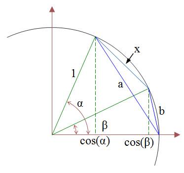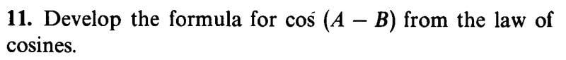 The discussion revolves around deriving the formula for cos(A-B) using the law of cosines and involves concepts from trigonometry and geometry, particularly focusing on angles and their relationships on the unit circle.