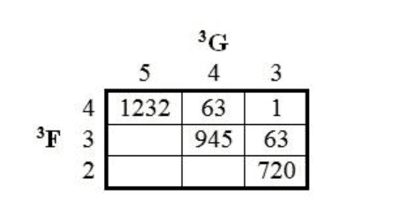 The table gives the theoretical relative intensities in LS-coupling for all possible ##^3F – ^3G## transitions.