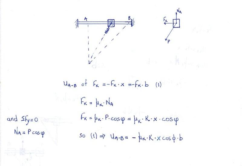 The discussion revolves around deriving the expression for the work done by the friction force on a slider moving along a rod, with a focus on the coefficient of kinetic friction and the spring's properties. The problem involves analyzing forces and distances in a mechanical system, specifically relating to friction and spring tension.