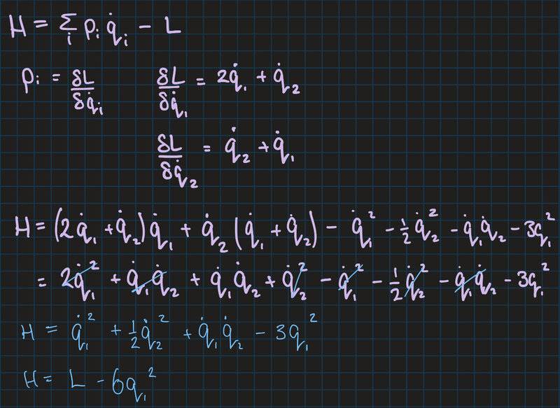 4. Comparing the given Lagrangian to the resulting Hamiltonian I found H =\dot{q_1}^2 + 0.5 \dot{q_2}^2 + \dot{q_1} * \dot{q_2} - 3q_1^2 = L - 6(q_1)^2 This is wrong because my Hamiltonian should be in terms of generalised coordinate and momentum only: H(q_1, q_2, p_1, p_2). What am I neglecting?