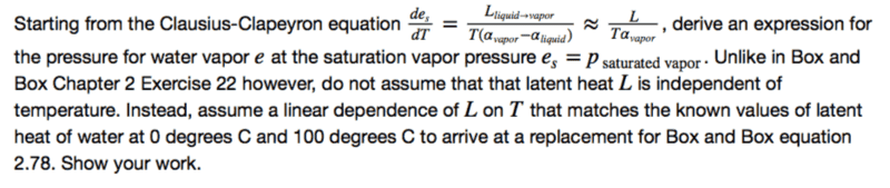 The discussion revolves around deriving the relationship between vapor pressure and latent heat dependence using the Clausius-Clapeyron equation. Participants are exploring the mathematical formulation of latent heat in relation to temperature, specifically focusing on the latent heat of vaporization at different temperatures.