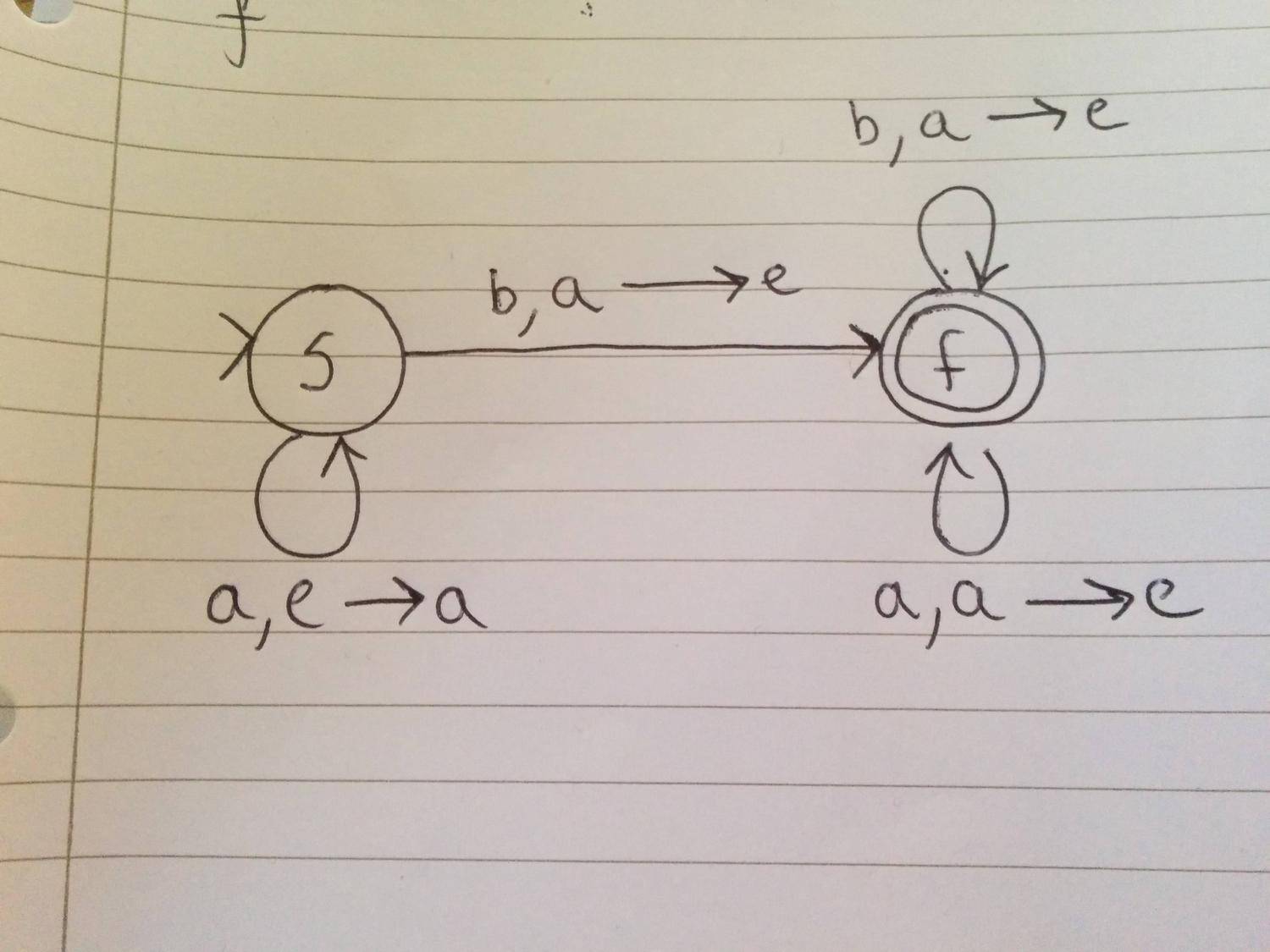 My understand is that from the start state, an A pushes an A to the stack and stays in the initial state s. Getting a B whilst in state s pops an A from the stack and moves to final state f. Getting a B whilst in state s also pops an A from the stack and remains in state f. And getting an A in the final state whilst A is on the stack remains pops an A from the stack.