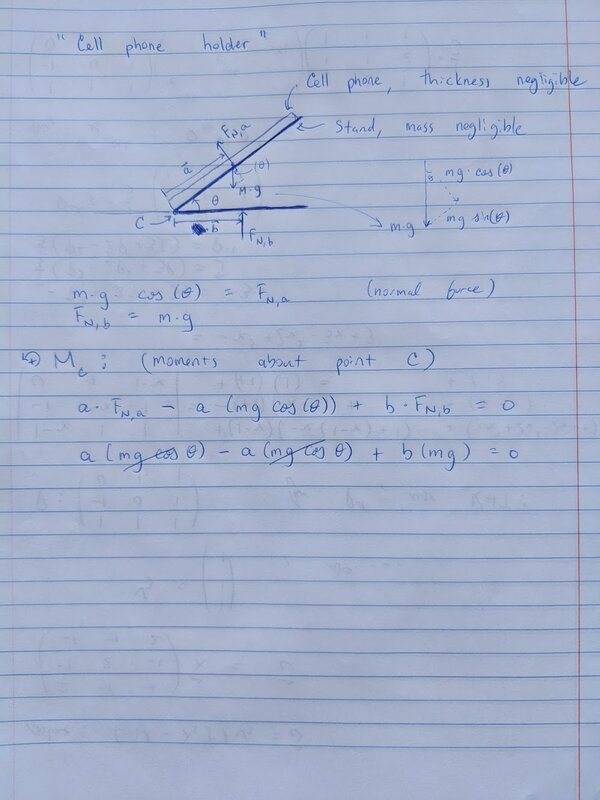The discussion revolves around the design of a cell phone stand, specifically focusing on the force balance and stability of the holder. Participants explore various aspects of mechanical design, including the dimensions of the base, the center of mass, and the forces acting on the phone holder.