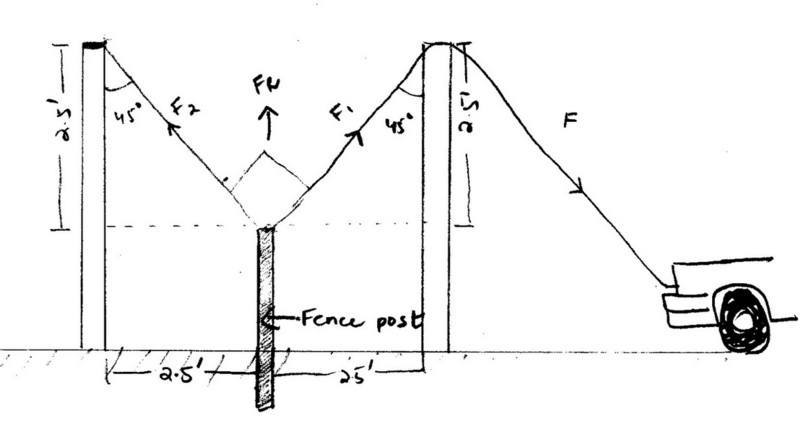 I have planned to use two planks of wood as a support. The planks will be place on equal distances from the post and that distance will be of their height. The rope will be tied to one plank and will pass through the fence post (using a hole or hook in the post) and above the second plank and tied to the truck. But I am confused about 2 issues.
