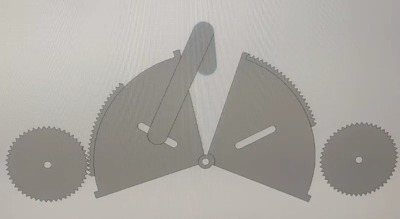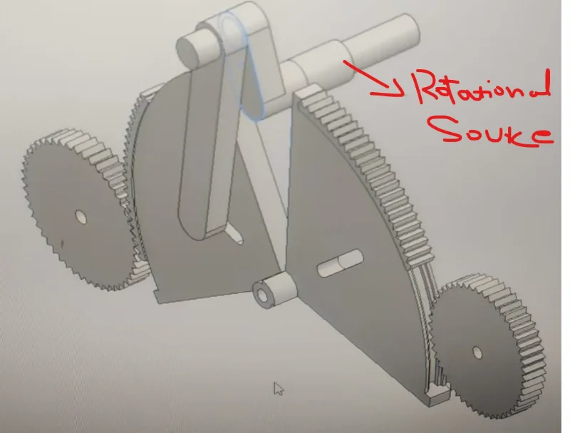 I would like to draw a mechanism that two half circles should rotate synchronous close and open as a result gears will rotate at same Value , i would like to use springs in this mechanism between circles , the other idea i know that use crank and slider , link from slider attached to both circles as a result opening and closing will happen , but i would like to use springs and the input rotational source should be one as shown in figure