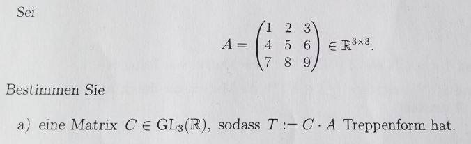 I want to determine a matrix $C\in GL_3(\mathbb{R})$ such that $T:=C\cdot A$ has echelon form. Performing an elementary row operation is equivalent to multiplying an invertible matrix, right? (Wondering)