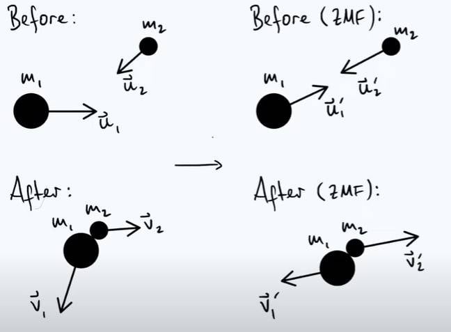 - Further elaboration includes a reference to a video and diagrams that illustrate the transformation to the ZMF, with questions about the implications of momentum and angle definitions in the context of the problem.