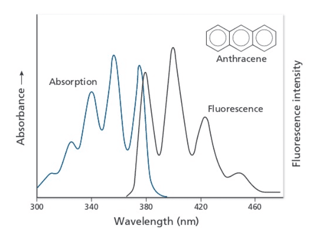 1) From Figure B, I would assume that the first Fluorescence peak at 380 nm in Figure A corresponds to S1,v=0 -> S0,v=1 and the second peak at 400 nm corresponds to S1,v=0 -> S0,v=2. Larger transition results in higher emission energy or smaller wavelength.