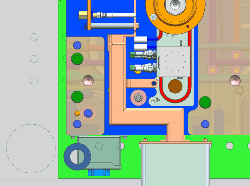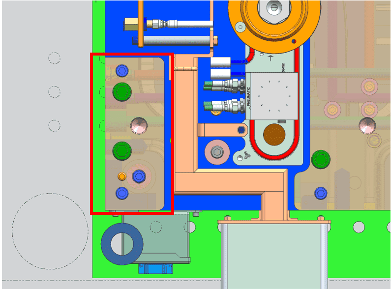 Side view of the system (this is how the tool is ran in the injection mold press when processing parts. The clamp plates are bolted onto the press platen so the tool hangs sideways as shown):