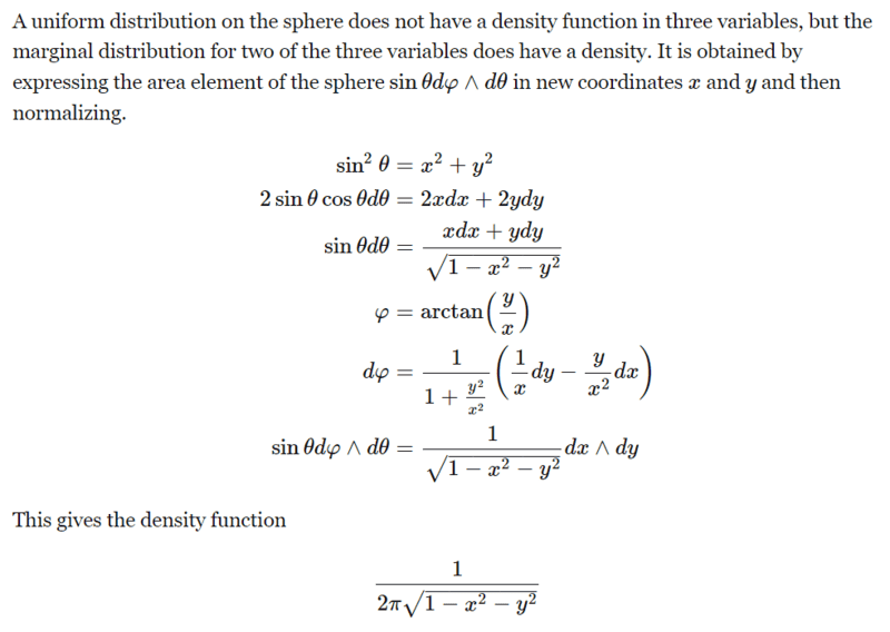 - The marginal distributions of say ##X## is obtained by integrating out the other variables. The surface area of the unit sphere is ##4\pi##.