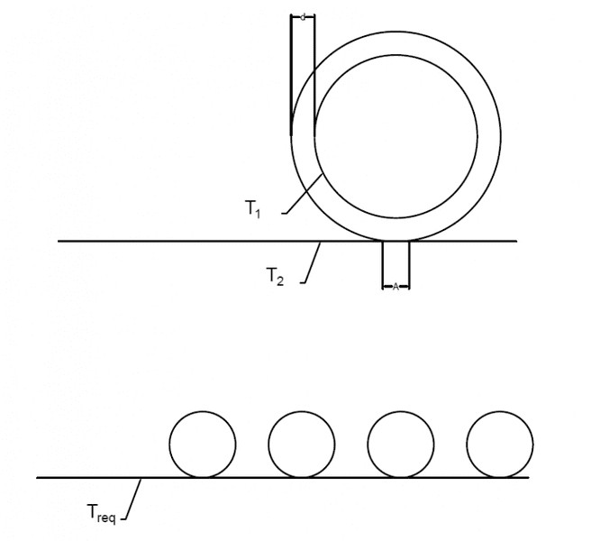 I've been tasked to see if I could determine the number of chill rollers needed to cool down glue being extruded onto a fabric. I'm not sure if my method is valid. The roller has wall thickness d with contact area A. Water inside chill roller is at T1 and glue is at T2.