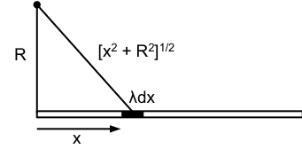 - A rod with a circular center in the middle (which causes the rod to change direction by 90 °) has an evenly distributed linear charge density 𝜆 of electrons along the entire rod. Determine the electrical potential of the red dot in the figure below which is at the center of the circular round. The reference potential is 0 V far away from the rod.